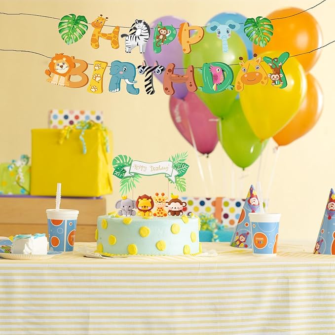 - PACKAGE INCLUDED: The Jungle Safari Animal Cake Toppers package includes 1 x elephant, 1 x giraffe, 1 x lion, 1x monkey, 1x happy birthday cake topper, 7 x palm leaves. Cute animal figures allow you to create a vibrant jungle scene on top of your cake.
