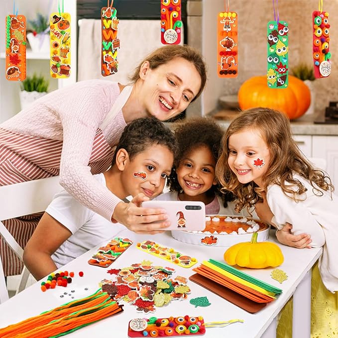 - 【What Will You Receive】You will receive 880 Thanksgiving foam bookmarks craft DIY kit, Including 36 colorful foam blank bookmarks, 150 colorful self-adhesive foam stickers of Thanksgiving design, 150 glitter leaves self-adhesive foam stickers in heart shape, 200 pom-poms, 1 sheet rhinestone sticker, 36pcs pipe cleaners,100 googly eyes,100pcs double-sided sticky dots, 36 root of satin cords, enough to meet your creative needs