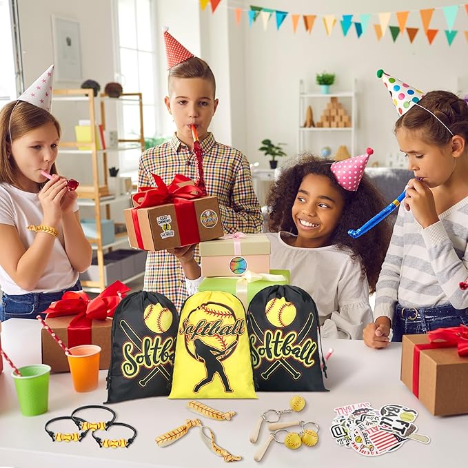 - Abundant Quantity for Gifting and Decorating: with a package that includes 100 sheets of softball stickers, 12 softball drawstring bags, 12 hair ties, 12 softball keychains, and 12 softball wristbands, you'll have plenty of goodies to go around for all your guests