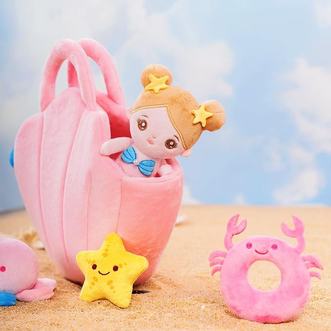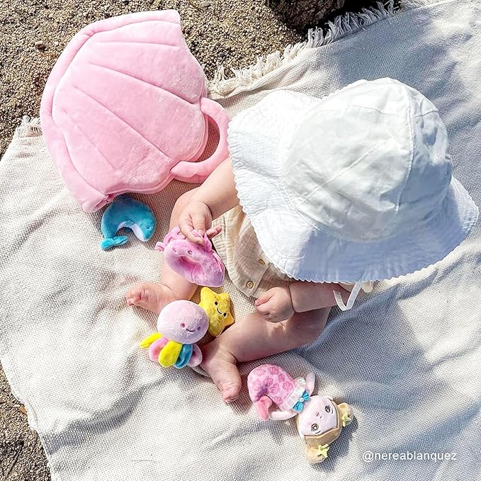 - 🧜PLUSH MERMAID PLAY SET: This soft playset has an 11" clamshell bag to store 1 Little Mermaid princess doll and 4 soft sensory toys: a blue dolphin and ringed crab that makes a bell ringing sound, an octopus with different colored tentacles that also make squeaking sounds, and a starfish that makes crinkling sounds. Toddlers exercise their sense of hearing while recognizing different sea animals toys!