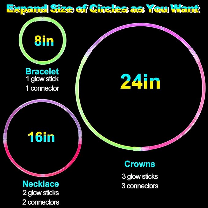 - 💗Colorful Glow Sticks: Multi-colored, long-lasting and eye-catching glowsticks have a glow time of 8-12 hours. Snap it and it will become pretty shining in the dark. Use the light sticks included connectors to form glow bracelets and necklaces, will accompany you to the whole party.