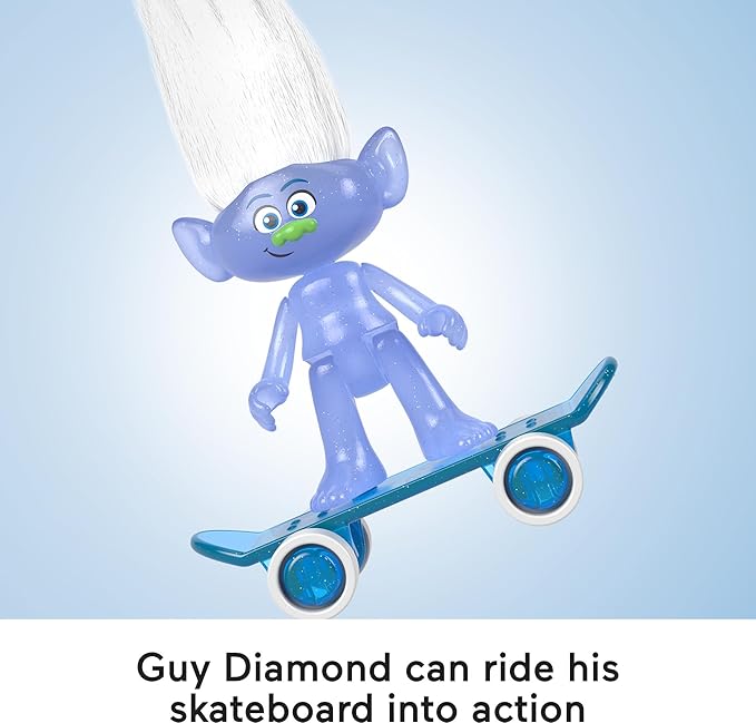 - Guy Diamond rolls into action on his skateboard; Branch’s roll-along sparkly motorcycle has spinning flowers; push Poppy on her roll-along hoverboard to see the flower spin