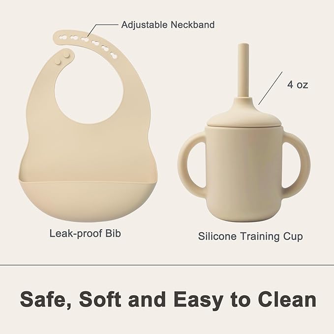 - Baby LED Weaning Supplies: Our silicone bibs are designed with deeper, stronger pockets that catch dropped food very effectively and are easy to clean. The adjustable round design is extra gentle on baby's skin. Our training cups are crafted to fit snugly in baby's little hands and mouth, protecting their developing teeth. Helps babies transition from breastfeeding to independent drinking.