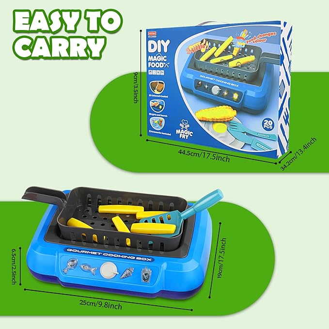 - Realistic Pretend Food Grill Playset: This kids grill playset includes 20PCS (one realistic grill and nineteen play kitchen accessories). 4A Batteries needed which are not included. Its color will be changed while kids cook, which can encourage interactive role play and improve little ones's social and emotional skills, through giving children a more realistic cooking experience.