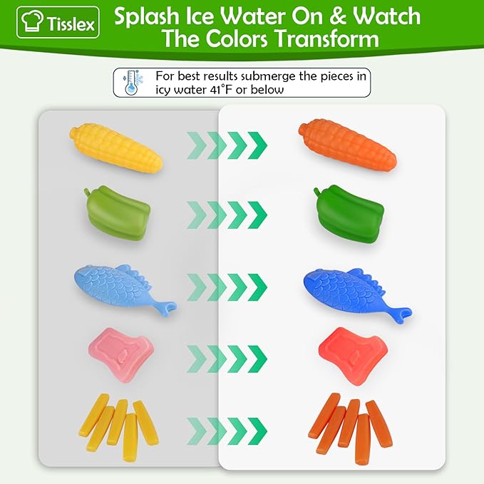 - Colors Change: Add ice water to bring your pretend play meal to life! This kids play food changes color upon contact with ice water. For best results submerge the pieces in icy water 41˚F or below. Warm Tips: Water from the sink may not work in summer.
