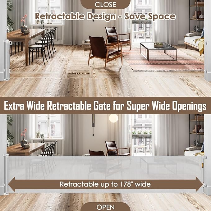 - Versatile Extra Wide Baby Gate: This retractable baby gates can be used as a baby fence, pet barrier, semi-enclosed baby play yards, fireplace gate and room divider, providing more options for homes with open floor plans or wide spaces, and also for your divide some space flexibly for babies and dogs.