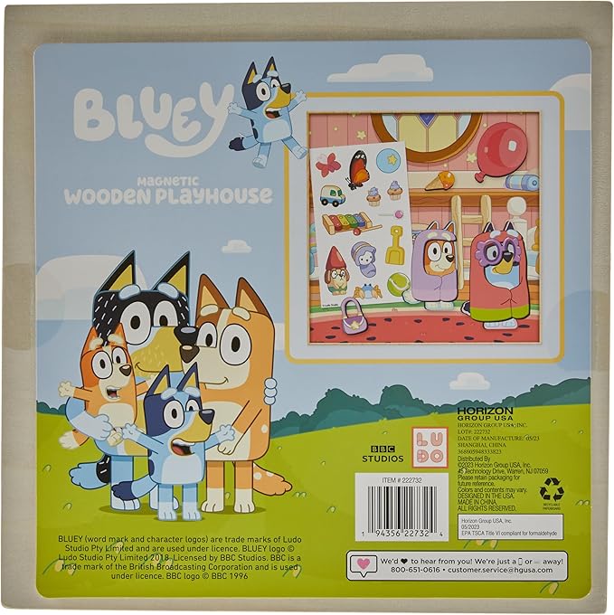 • SET INCLUDES: 2 Magnetic Wooden Dolls (Bluey, Bingo), 1 Wooden Playhouse (11 in. x 2 in. x 11 in.), 12 Magnetic Accessories, 1 Repositionable Sticker Sheet, 2 Double-Sided Background Insert (11 in. x 11 in.), Easy-to-Follow Instructions