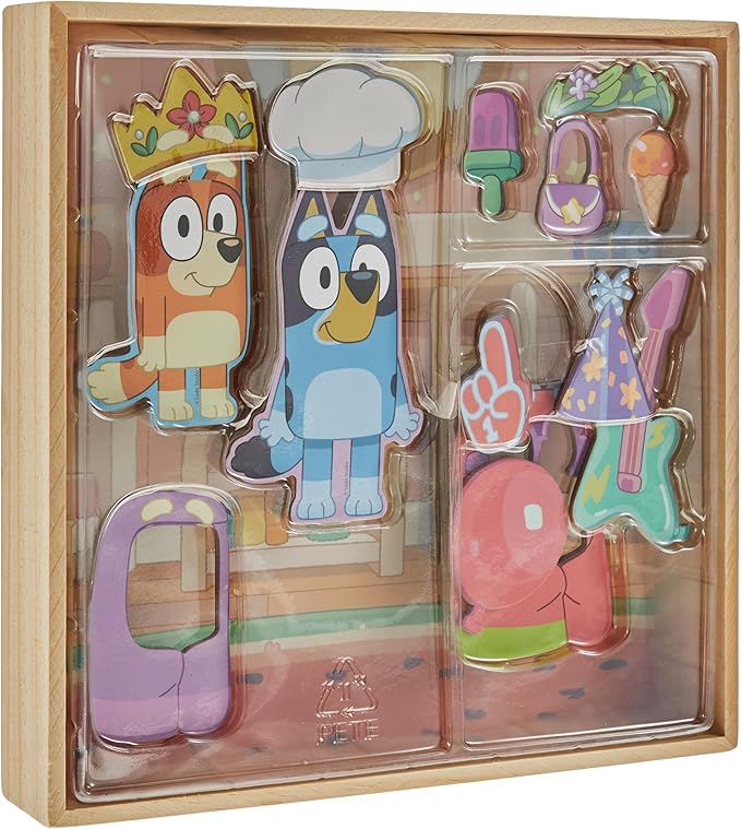 • MAGNETIC PIECES & REUSABLE STICKERS: Bring your favorite on-screen characters off-screen as you mix & match 12 different magnetic outfits and accessories on wooden Bluey & Bingo dolls, then give them toys, treats, and accessories with repositionable stickers!