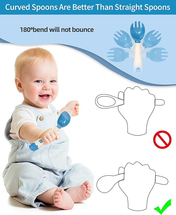- [Ergonomic Design] The tableware is specifically made to help babies with their grip training. It can bend in any direction without rebounding, enabling the infant to eat at different angles and encouraging the development of agility and hand-eye coordination.