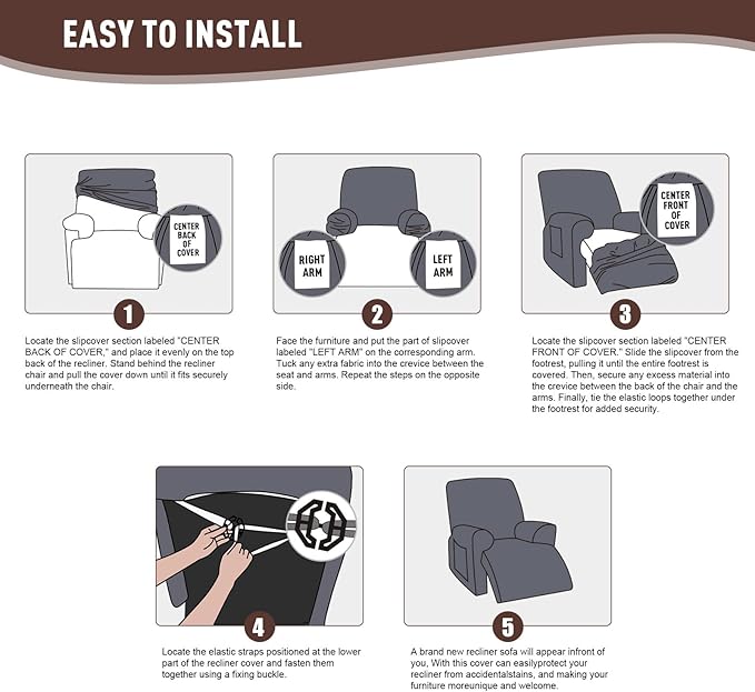- EASY TO INSTALL: Our recliner sofa slipcovers have exquisite workmanship, including 2 pieces arm covers, 1 piece seat cover and 1 piece back seat cover, 4 pieces cover totally. The recliner covers also equips with bottom elastic and reinforcement straps, you can use buckle to make the cover in place without moving.