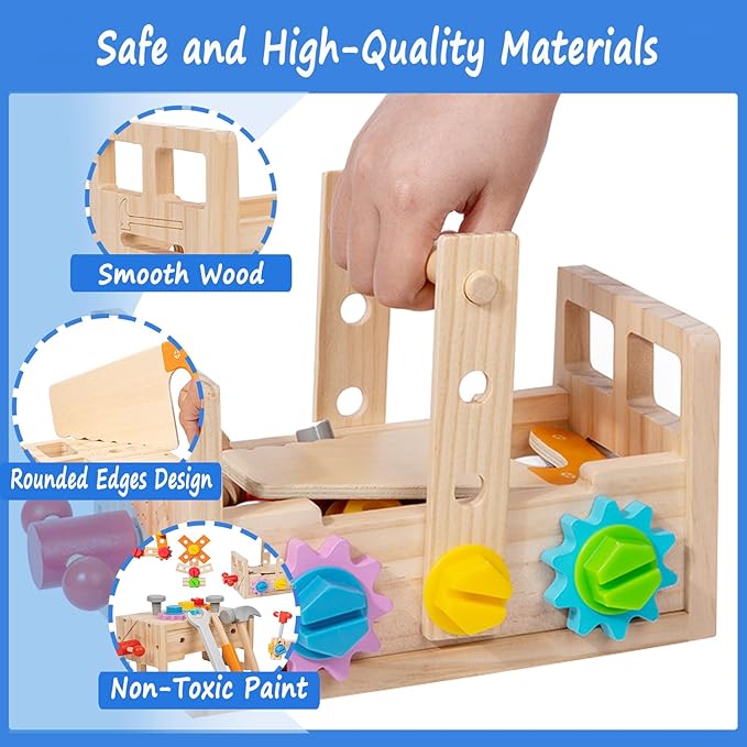 - SAFE & HIGH QUALITY MATERIALS - The tool toys set for kids is made of high quality solid wood, sturdy and durable, Smooth surfaces, non-toxic water-based paint, and designed with rounded edges to protect the kids from getting hurt.