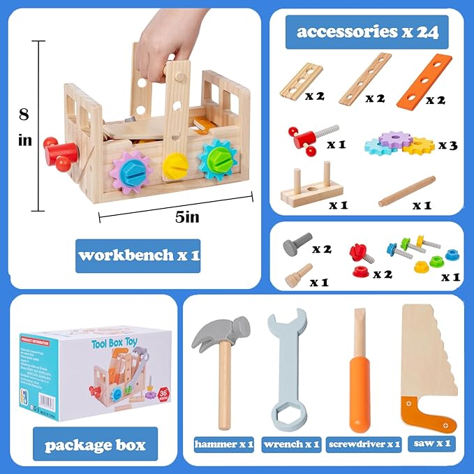 - 25 PCS WOODEN TODDLER TOOLS SET with BOX - In addition to the wooden tool box, there are also a variety of tools, 1 hammer, 1 hex wrench, 1 screwdriver and 1 saw blade as well as a variety of screws and other small accessories. Brightly colored components allow kids to fully experience the fun of wooden tool kit toys.