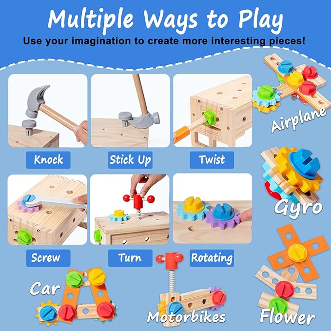 - MONTESSORI STEM EDUCATIONAL TOYS - A variety of brightly colored wooden toy tools can be combined into a variety of interesting shapes, such as windmills, motorcycles, airplanes, gyroscopes, cars and other creative shapes you want. The toddler tool kit set helps to cultivate kid's ability to recognize colors, quantities and shapes, enrich their imagination, stimulate children's creativity and improve their hands-on ability.