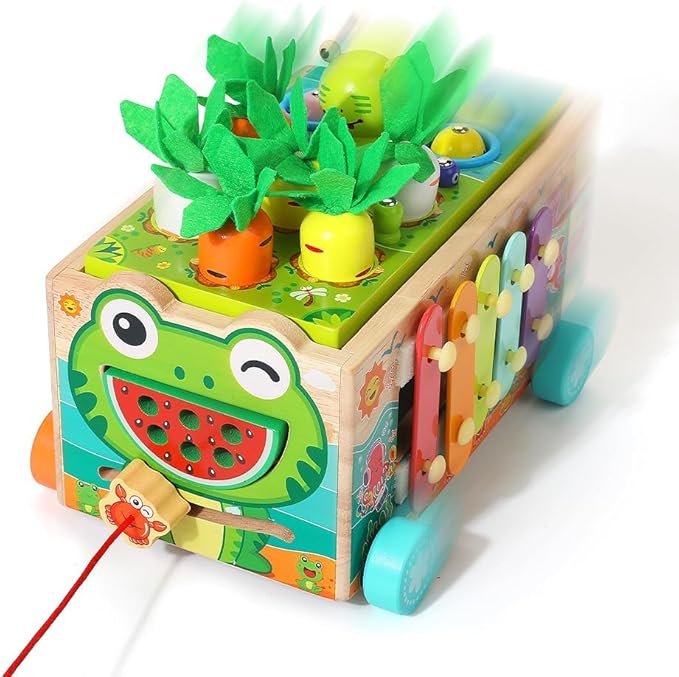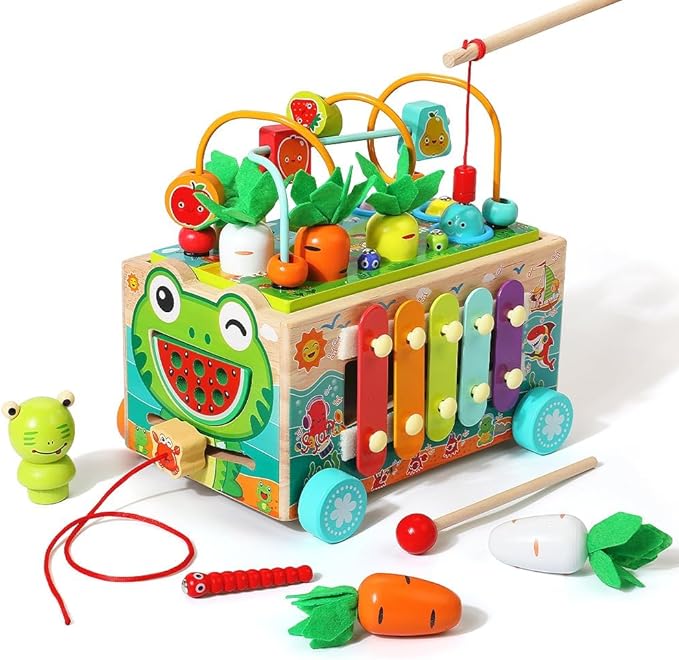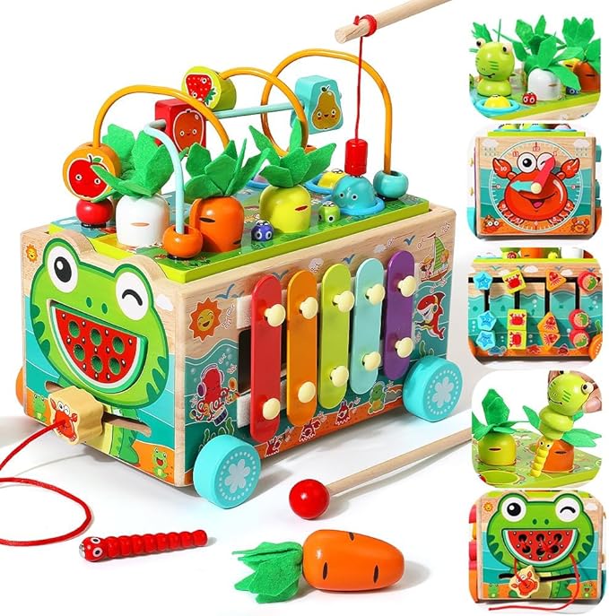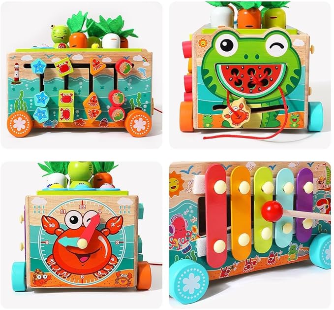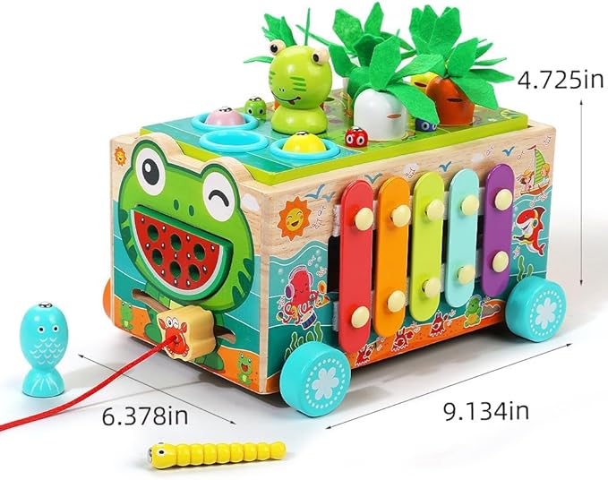 - TODDLER MONTESSORI EDUCATYIONAL TOY - Carrot harvest, fishing games, frog catching worms game - exercise children's imagination, hand-eye coordination. Bead maze game - exercise 1 2 3 years old children's brain power. Color shape building block maze - train kids’ color and shape recognition. The crab alarm clock - teach children to recognize time and numbers. The xylophone toy - can make a pleasant sound when struck. Syllables, bright and light musical sounds can quickly attract children's attention, and look forward to your children becoming little musicians!