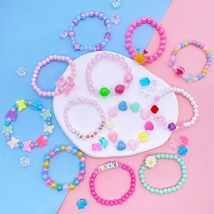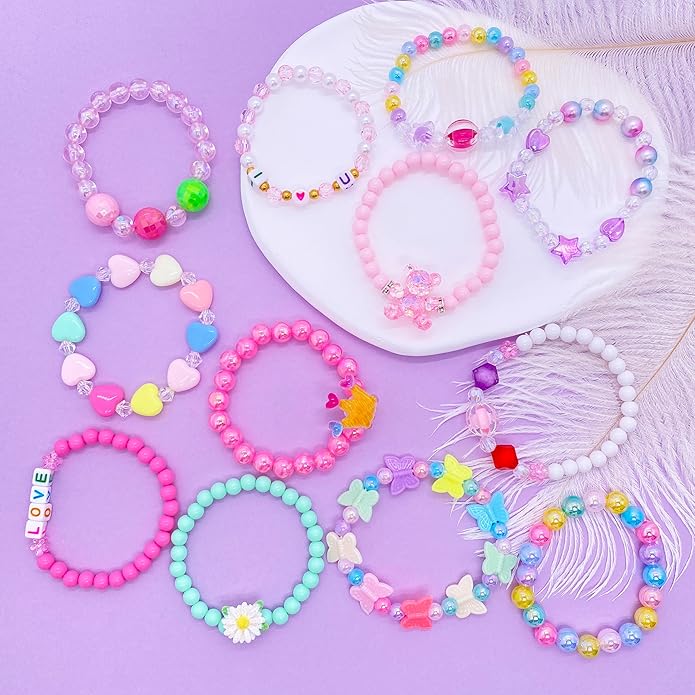 - Charming and Trendy: Our bracelet sets feature vibrant acrylic beads with an array of delightful designs, including multicolored patterns, flower, butterfly, "LOVE" lettering, adorable hearts, and crowns. These playful accessories are for young fashion enthusiasts ages 3- 8 and make for an excellent birthday present or a sweet addition to any dress-up collection