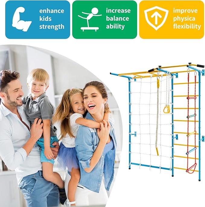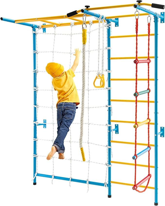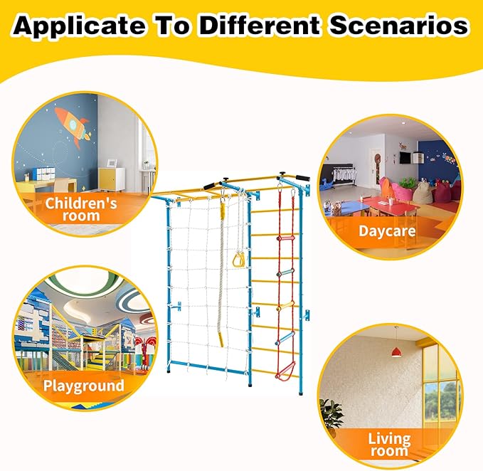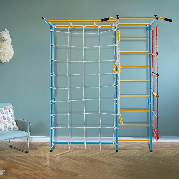 - ▶Multiple Modes of Ladder Wall Set --The kids' stall bars for exercise boasts multiple modes of play, you can encouraging children to explore different ways of staying active and fit. From rope ladder, rope wall, pull-up bar, wall ladder to rope, monkey bars and gymnastic rings. Our indoor playground provides endless hours of fun and entertainment for kids of different ages. Please install fall protection device during use.
