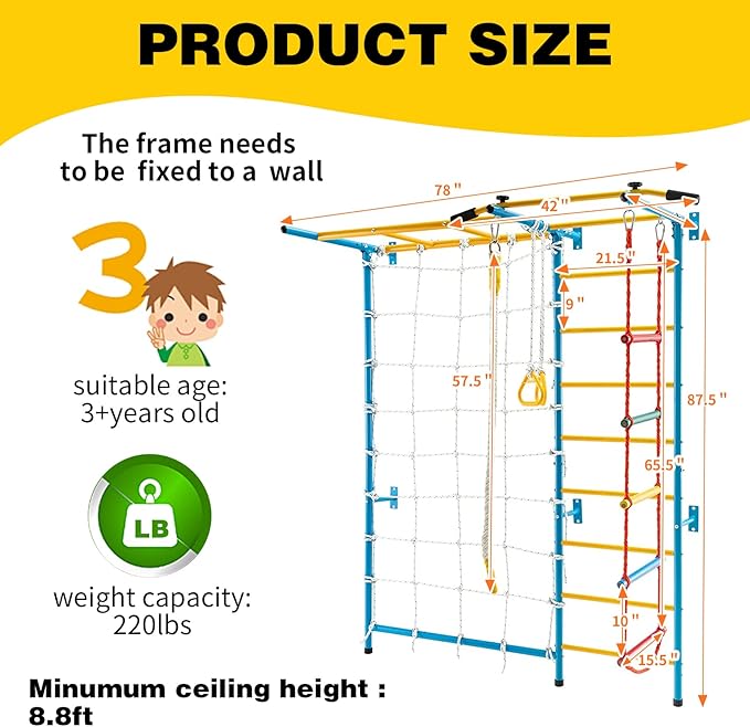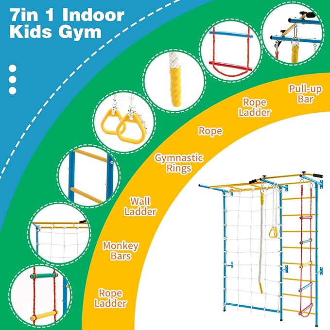 - ▶Easy to assemble--The indoor kids gym set dimensions 78”x7’4”, making it perfect for a children's play room, living room, daycare, or a kids playground. Come with complete detailed assembly instructions and tools so you can assemble them in less time. Note: the gymnastic stall bars must be fixed to a masonry/brick wall, not on a sheetrock wall.