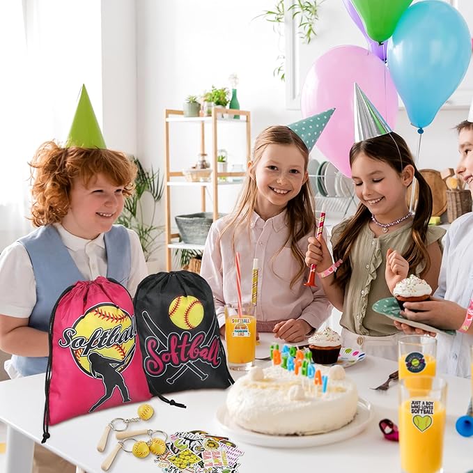 - Abundant Quantity for Gifting and Decorating: with a package that includes 100 sheets of softball stickers, 12 softball drawstring bags, 12 hair ties, 12 softball keychains, and 12 softball wristbands, you'll have plenty of goodies to go around for all your guests