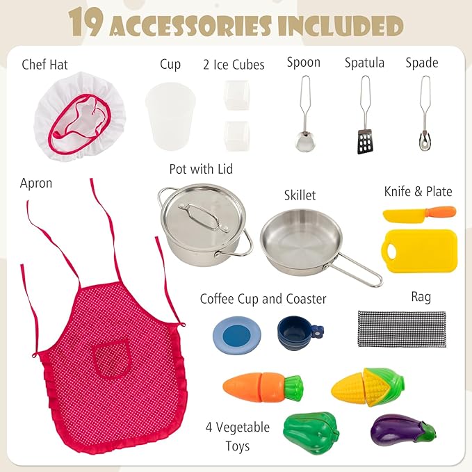 - 🌟【Bonus 19 Accessories & Flexible Storage Space】This kid toddler kitchen play sets come with an apron, chef hat, rag, pan, pot with lid, cup, 2 ice cubes, 3 kitchen utensils, 4 cutting vegetables, knife & cutting board, teacup & cup mat. In addition, 3 hanging hooks, 2 open shelves, 2 non-woven fabric drawers, 3 enclosed cabinets and a 2-tier cabinet are provided for extra storage.