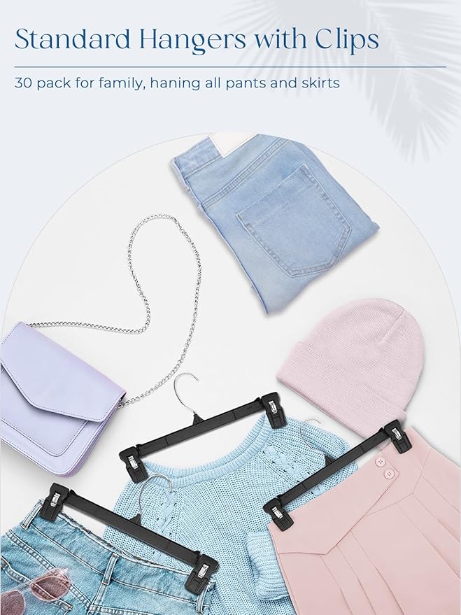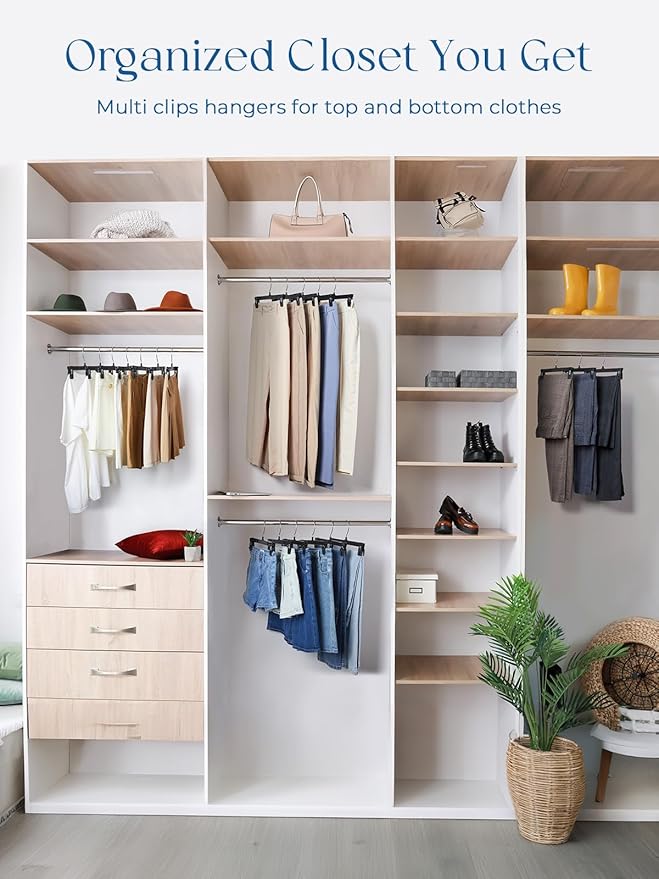 - 【RUST-RESISTANT & DURABLE - With stainless steel hook, upgraded higher density ABS plastic as main body make its longevity guaranteed】: Our hanger for pants is more durable than those common or movable metal clips hangers, far away from being rust or broken after long time exposing in the sun or in damp environment.