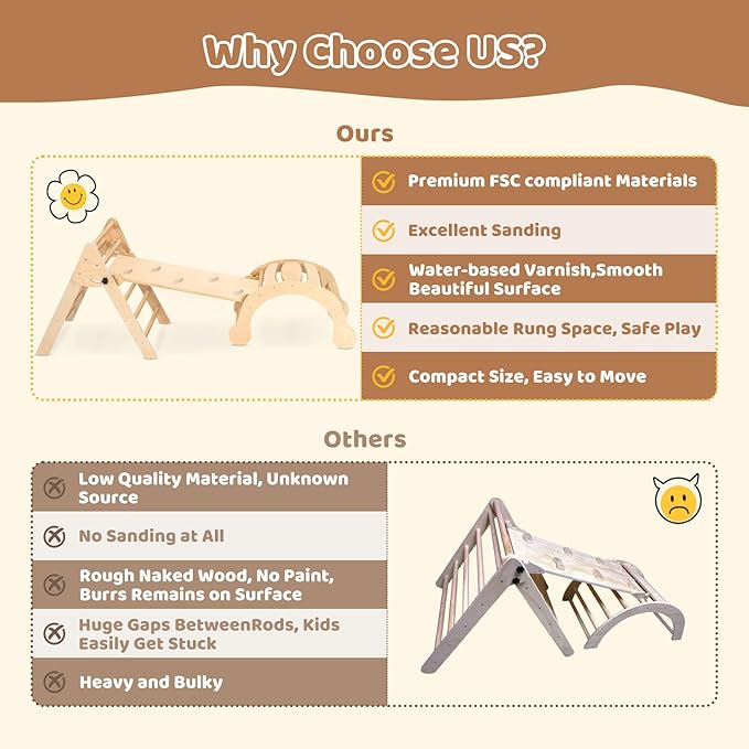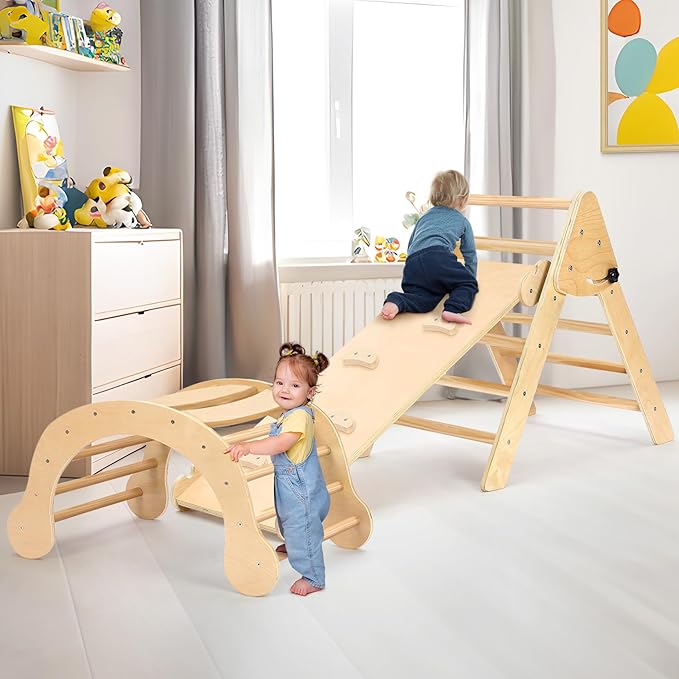 - 【Designed with Kids in Mind】Every element of this pikler triangle set is thoughtfully designed to enhance the climbing experience. The rung spacing, the top bar, grooves at the joints, and 3 extra-wide panels on the top of the pikler arch are all specifically designed to ensure the structure's stability and provide the best possible adventure for children, ensuring durability, safety, and enjoyment