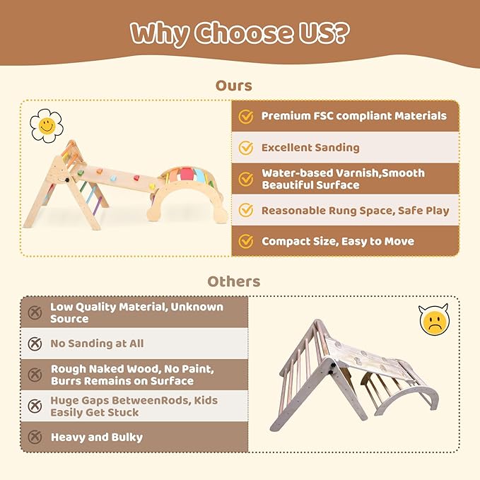 - 【FSC-compliance Wood with Safe Paint】Playing should be fun, but also safe. Crafted from high-quality natural wood which is FSC-certified, and hundreds of polishing and sanding, coated with non-toxic paint, YOLEO pikler triangle climbing set is designed to be smoother, stronger, and long-lasting, enabling kids to play and grow up safely. All YOLEO toddler climbing toys indoor are rigorously tested and certified by CPSC-approved labs