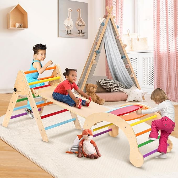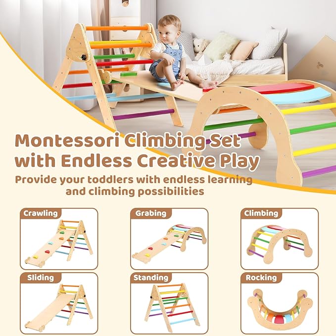 YOLEO 7-in-1 Pikler Triangle Set, Large Wooden Climbing Toys for Toddlers 1-3 Inside, Montessori Fun Toddler Climbing Toys Indoor Playground and Jungle Gyms Playset,Easy-Fold Pikler Triangle (Rainbow)