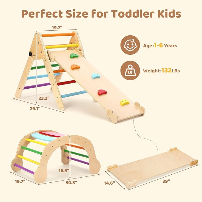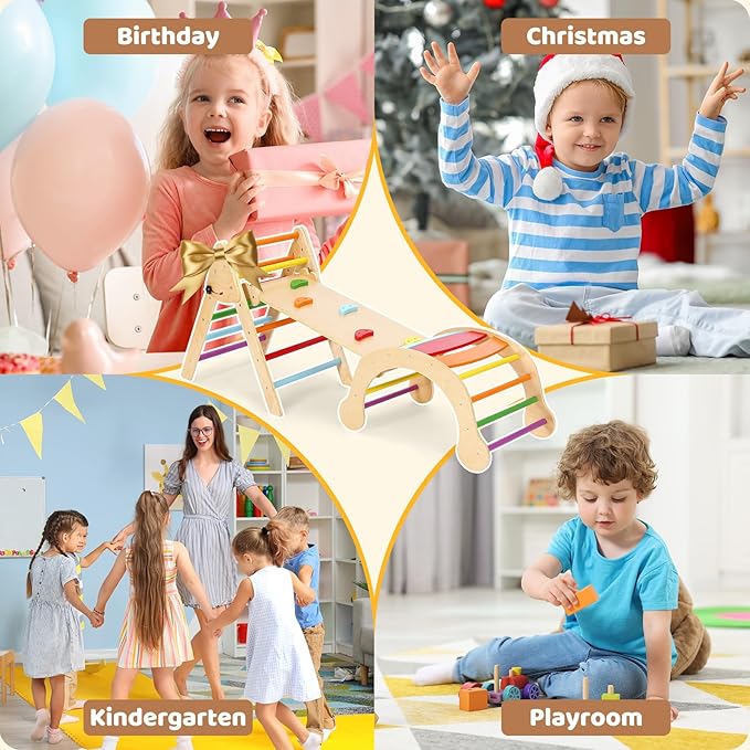 - 【Designed with Kids in Mind】Every element of this pikler triangle set is thoughtfully designed to enhance the climbing experience. The rung spacing, the top bar, grooves at the joints, and 3 extra-wide panels on the top of the pikler arch are all specifically designed to ensure the structure's stability and provide the best possible adventure for children, ensuring durability, safety, and enjoyment