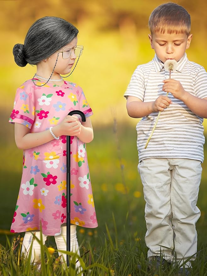 - What's Included - Our old lady costume for kids set includes 1pcs old lady dress, 1pcs black white bun wig, 1 set of old lady glasses with 1pcs chain, 1pcs pearl necklace, 1pcs pearl bracelet, 1pcs wig cap, and 1pcs kids cane prop. Great 100th day of school costume for girls cosplay.