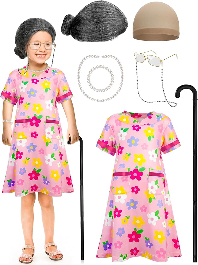 - What's Included - Our old lady costume for kids set includes 1pcs old lady dress, 1pcs black white bun wig, 1 set of old lady glasses with 1pcs chain, 1pcs pearl necklace, 1pcs pearl bracelet, 1pcs wig cap, and 1pcs kids cane prop. Great 100th day of school costume for girls cosplay.