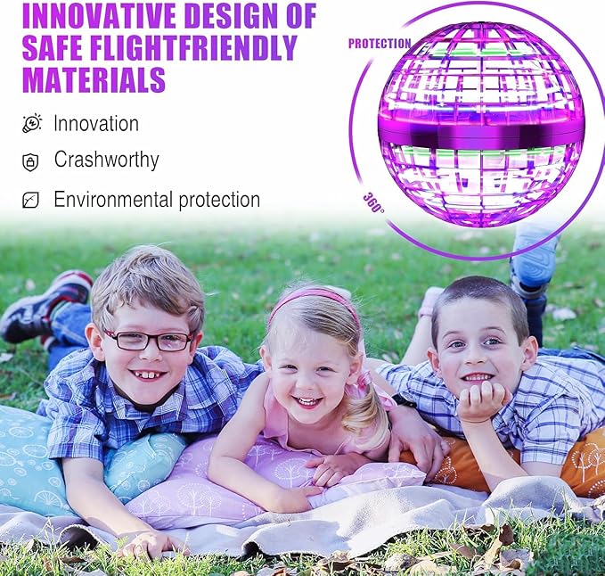 • Safe Design And Durability: The flying orb toys conducted rigorous tests. Materials is very soft, the protective shell of spherical design is adopted to ensure the safety, the durability and impact resistance of the flying ball toy.This flying ball drone toy is made of high-grade ABS material, which is lightweight and flexibl. The propellers are safely concealed within the ball drone. The enclosed propellers cause no worry that children will be hurt by their blades.