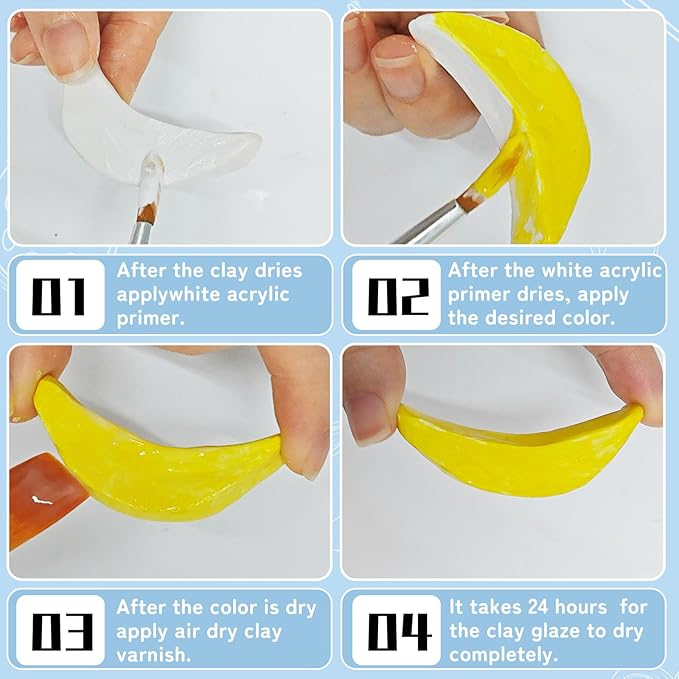 - Steps to Use: 1. After the clay work is dry, give it a thick layer of white acrylic primer, 2. Wait for the primer to dry, then apply the desired color, 3. Wait for the color to dry, then apply our air dry clay paint, it takes 24 hours for air dry clay glaze to dry completely