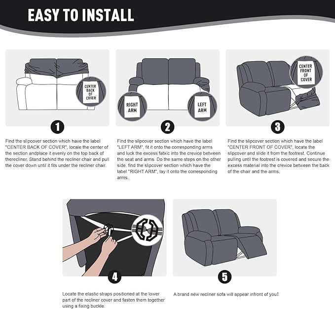 • EASY TO INSTALL: Our loveseat recliner covers have exquisite workmanship, a total of 6 pieces set, including 2 seat covers, 2 armrest covers, 2 cushion covers. The recliner covers also equips with bottom elastic and reinforcement straps, you can use buckle to make the cover in place without moving