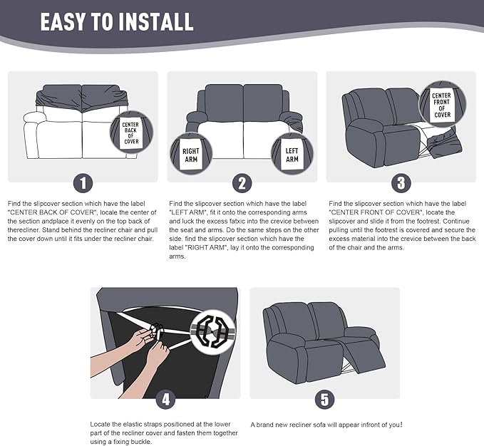 - EASY TO INSTALL: Our loveseat recliner covers have exquisite workmanship, a total of 6 pieces set, including 2 seat covers, 2 armrest covers, 2 cushion covers. The recliner covers also equips with bottom elastic and reinforcement straps, you can use buckle to make the cover in place without moving
