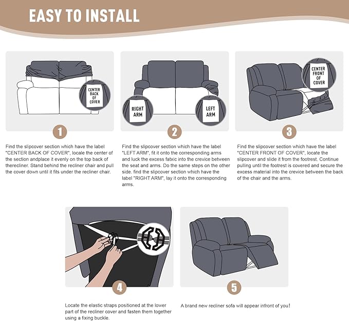 - EASY TO INSTALL: Our loveseat recliner covers have exquisite workmanship, a total of 6 pieces set, including 2 seat covers, 2 armrest covers, 2 cushion covers. The recliner covers also equips with bottom elastic and reinforcement straps, you can use buckle to make the cover in place without moving