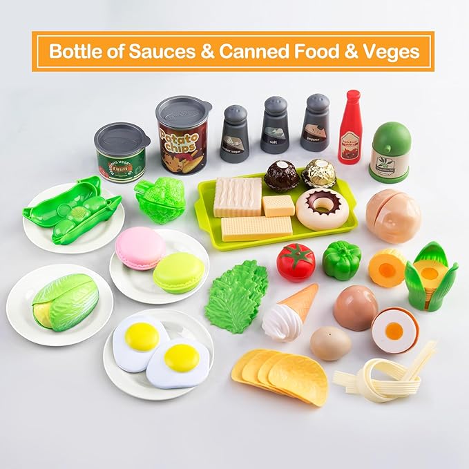 - 【Simulate life scenes & Cooking experience】Each kitchen set comes with 150Pcs stylish, open design and fresh colors pretend kitchen toys, include play pots and pans sets, kettle, bowls, plates, chopsticks, toy kitchen cookware, knives set, canned pretend cuttable food & vegetables & fruit with 2pack basket, fast food set, picnic cloth, dessert and prop money, much more to provide endless hours of fun