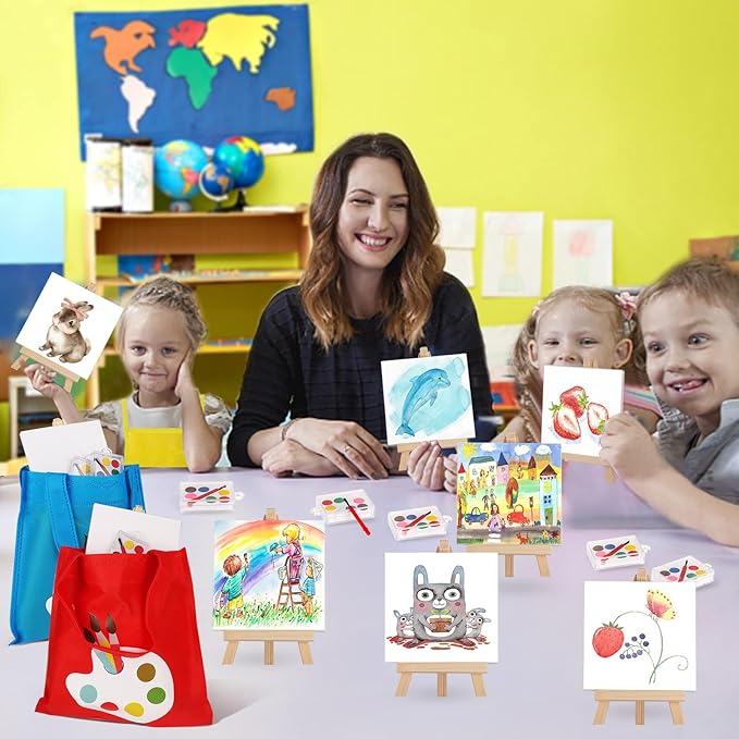 - Art Supplies For Kids - Each box contains 12 mini watercolor paint sets, 12 canvas bags, 12 child-sized aprons in 3 colors, and 12 painting canvas panels with a little wooden easel. A total of 48 gift sets for painting may be used to teach kids about various colors and painting techniques at a young age. The quantity is sufficient to meet the needs of 12 children for watercolor painting.