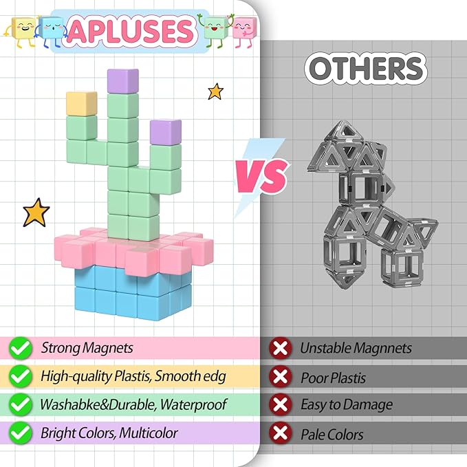 - 【Safe and Reassuring Toddlers Toys】Our Magnetic building blocks stand out from other magnet toys on the market due to their high-quality materials, guaranteeing durability and longevity. With a proper size design and smooth edges, these blocks make it easier for toddlers to grasp and build without the risk of scraping their hands. The enhanced magnetism ensures that children's creations remain stable and don't collapse easily. These blocks can withstand frequent use, providing lasting enjoyment and valuable learning experiences for children of all ages.