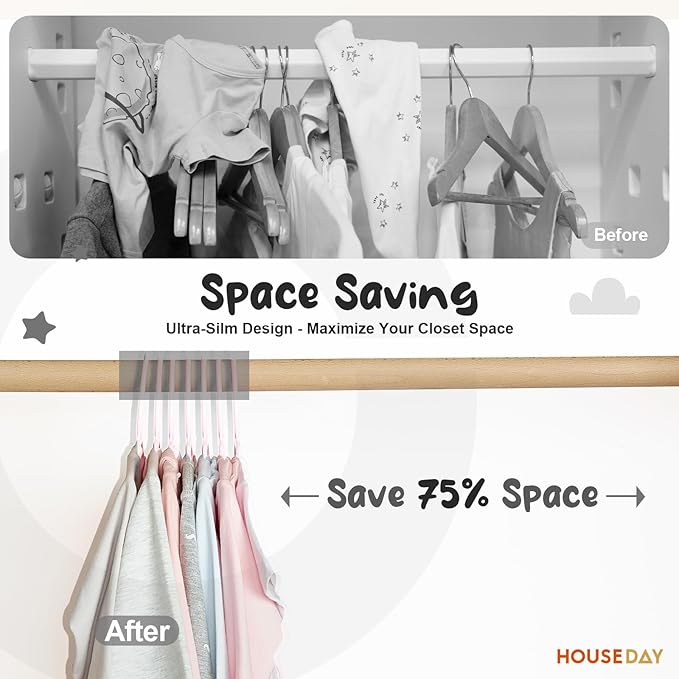 - Slim Space Saving - Maximizes closet space by allowing for efficient vertical organization, enabling consumers to store more clothes in limited closet space. This not only creates a clutter-free environment but also facilitates easy access to garments, streamlining the dressing process for parents and caregivers