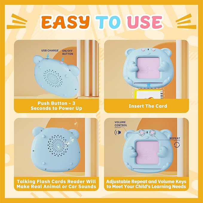 - 【Easy to Use and Portable】This montessori toy is user-friendly and lightweight, perfect for toddlers to use. Once the switch is turned on, children simply need to insert the flash cards into the card reader slot, and it will emit sounds to capture their attention. It allows for repeat playback and volume adjustment, making it convenient and compact. No matter where children go, this toddler learning device will accompany them.