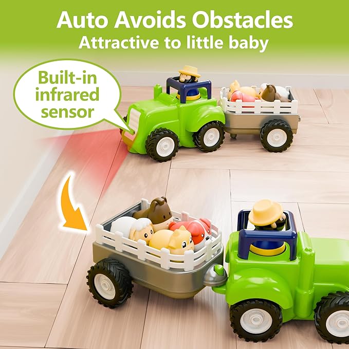 - 【Automatic Obstacle Avoidance Mode】In automatic mode, the farm vehicle can detect obstacles ahead and change its route. Place the farmer in the driver's seat and press down to start the tractor automatically. Attactive farm theme for Toddlers 1-3, 2-4.