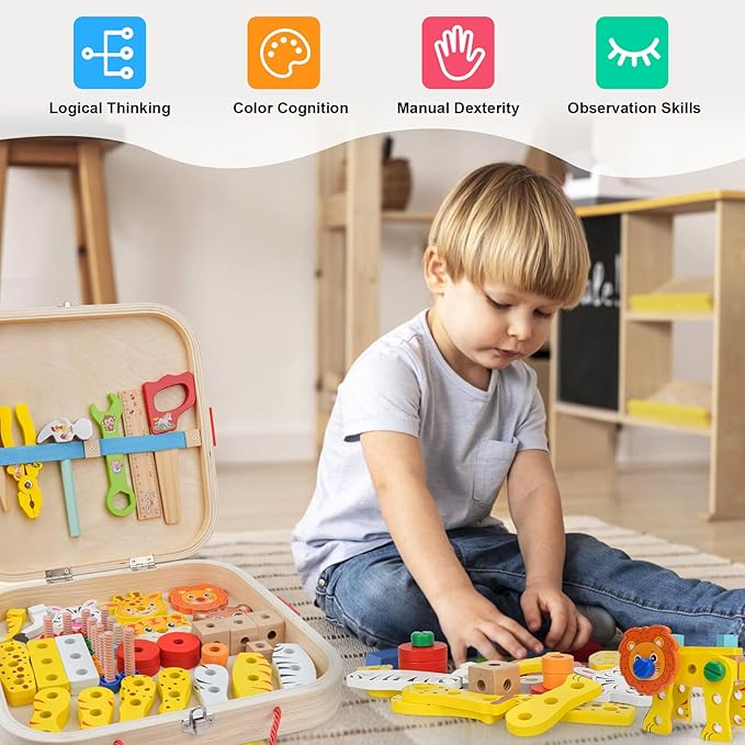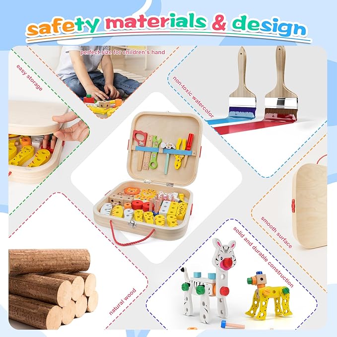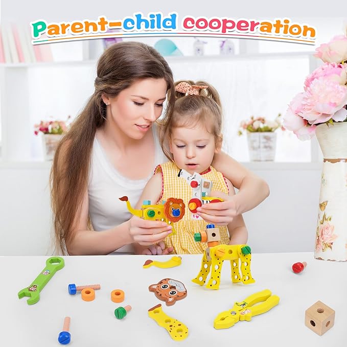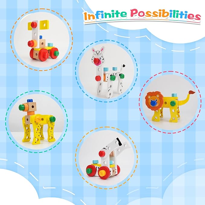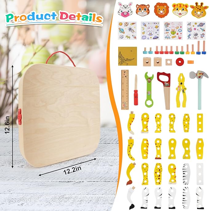 - 🧰【Animal assembly toy box】 This wooden assembly toy set includes wooden blocks, screws/nuts, animal blocks, stickers, and various assembly tools; Rich building block components can allow children to fully unleash their imagination and creativity to become a little inventors.