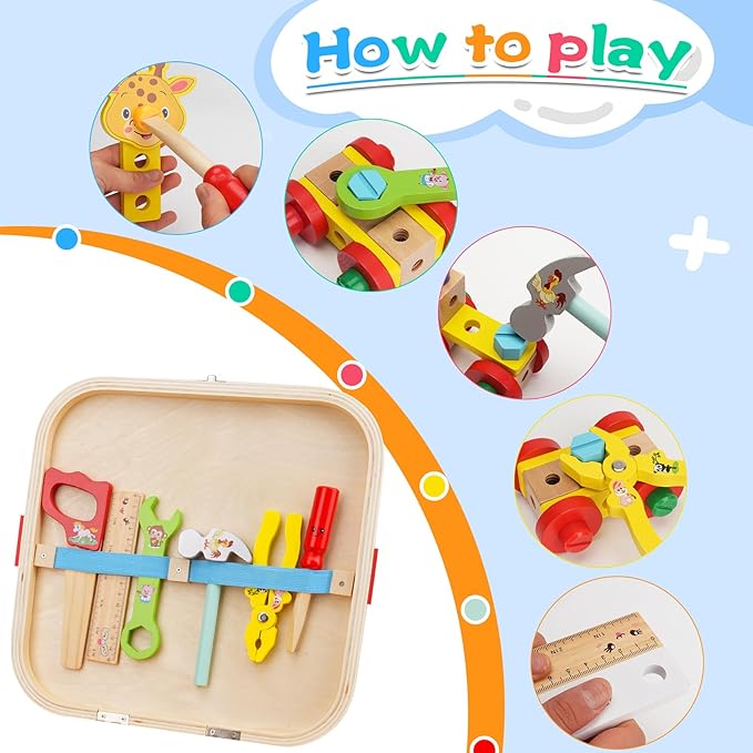 - 🔨【Become a little inventor】 The set is equipped with a wealth of building block parts and assembly tools, including screwdrivers, wrenches, hammers, pliers, rulers and saws. It is made entirely of wood, allowing children to create freely and safely simulate the toy repair process. This toy set can not only assemble animals, but also use your imagination to assemble cars, tanks, etc.