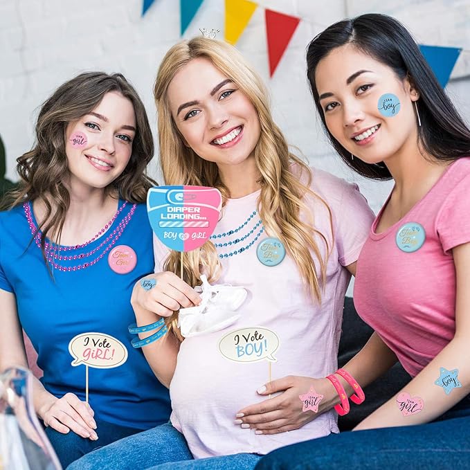 - Value Gender Reveal Party Supplies Favors:This gender reveal party supplies favors can serve 24 guests.We provide 2 pieces daddy and mommy to be badge pins,2 pieces daddy and mommy to be sashs, 24 silicone bracelets,24 team boy girl button pins, 24 necklaces, 30 photo props,96 team boy girl stickers,for a total of 202 pcs.Children and adults will love these cute gender reveal party supplies! It’s a perfect gender reveal party favors gift for new parents!