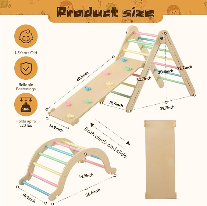 - 【Maximum Load Capacity & Safe Material】Our toddler climbing toys are made of high-quality natural wood and non-toxic paint, with no harmful chemicals or odors. After hundreds of polishing and sanding processes, the product surface is smoother, durable, and safe. It is also an aesthetic addition to your living room. With a maximum weight capacity of 130 lbs, this climbing structure is perfect for 2-3 children to play together and also provides a safe and enjoyable play environment for toddlers.