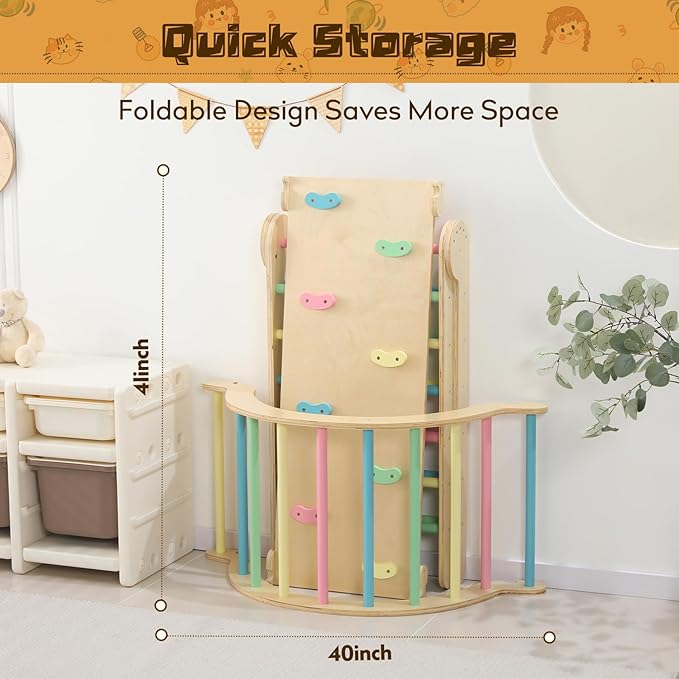 - 【Carefully Designed & Easy to Store】This Montessori Play Gym for Toddler has been carefully designed, taking into account the height, width, top bar, step spacing, and climbing angle, aiming to provide the best experience for your child. In addition, it is foldable for easy assembly and storage. Simply lift the climbing triangle, slide the removable side onto the fixed side, and close it. You can then store it in a corner, saving your space and time.