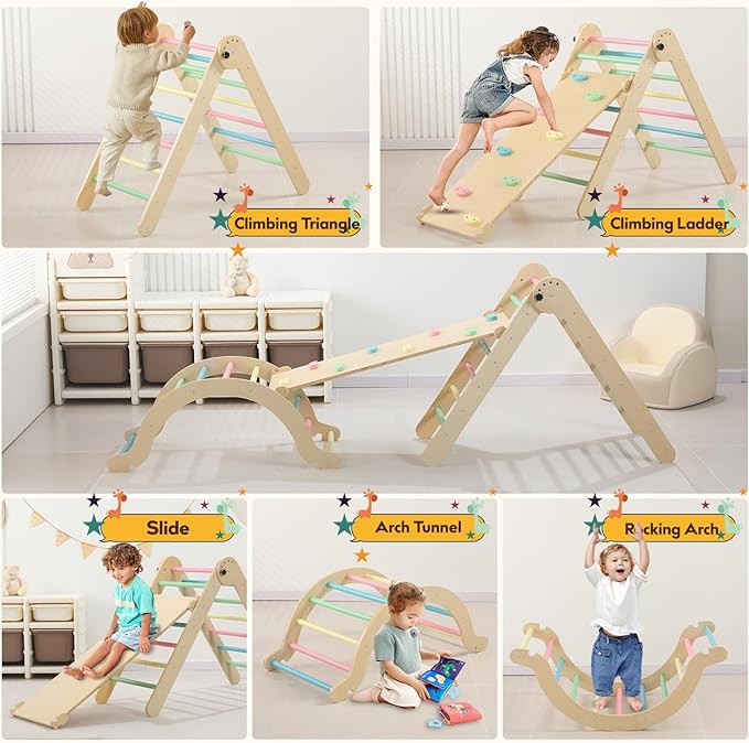 Wooden Pikler Triangle Set - 7 in 1 Montessori Foldable Toddler Climbing Toys for Early Learning - Includes Arch, Ramp, and Climbing Triangle - Indoor/Outdoor Playground Equipment for Toddlers