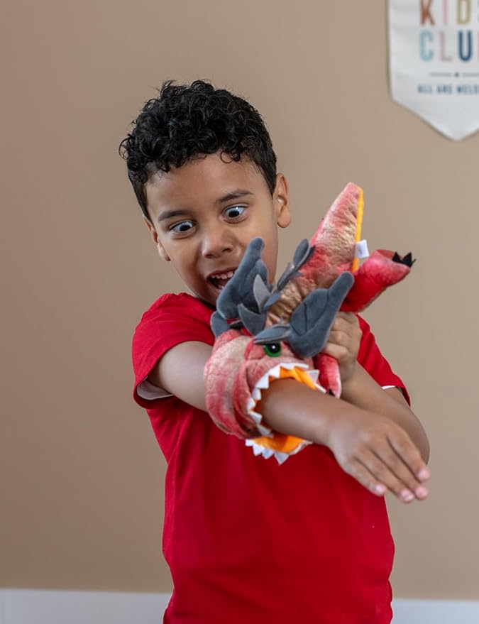 - Add a colorful cute plushie to your toddler toy collection with this realistic stuffed animal dragon with a wide open mouth.