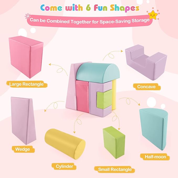 - 【Come with 6 Fun Shapes】: The foam block play set comes with 6 different shapes - large rectangle, wedge, cylinder, half-moon, concave, and small rectangle. These fun shapes can be combined together to build multiple modules, allowing your child to have endless fun and creativity.
