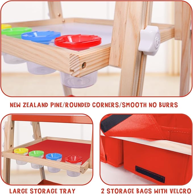 - 【HUMANIZED STORAGE SPACE FOR EASY ORGANIZATION】The toddler easel for kids adopts a extra-large double storage design(2 storage bag and a storage tray), kids easel for kids can hold all their art supplies, making them within reach during the painting process,ensuring your child can focus on creating masterpieces. 【Warm Tips】At the highest height, the storage bag and tray can be assembled and used together; At other heights, the storage bag needs to be used separately.